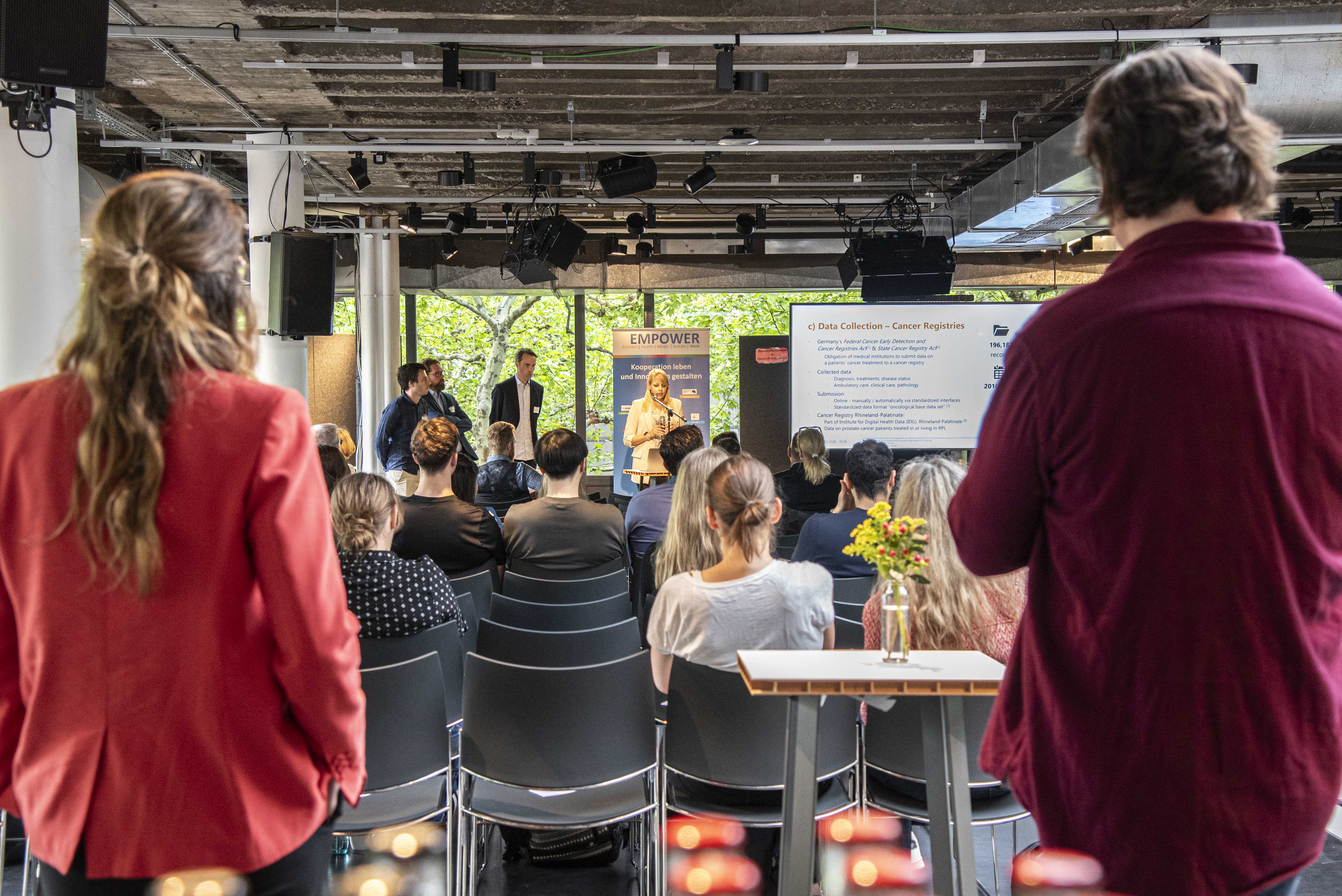 Fachlich gab es am Mittwochnachmittag einen umfassenden Einblick in aktuelle wissenschaftliche Projekte und Aktivitäten der Hochschulen im EMPOWER-Verbund: Den Auftakt bildete ein Team um Prof. Dr. Sven Pagel und Prof. Dr. Tobias Walter von der Hochschule Mainz, das mit Hilfe von Process Mining und Machine Learning Gesundheitsdaten in Rheinland-Pfalz analysiert. Ziel des Projekts ist es, am Beispiel von Prostatakrebs Behandlungsmuster zu erkennen und Potenziale zur Vorhersage und Verbesserung von onkologischen Behandlungsverläufen zu erschließen.