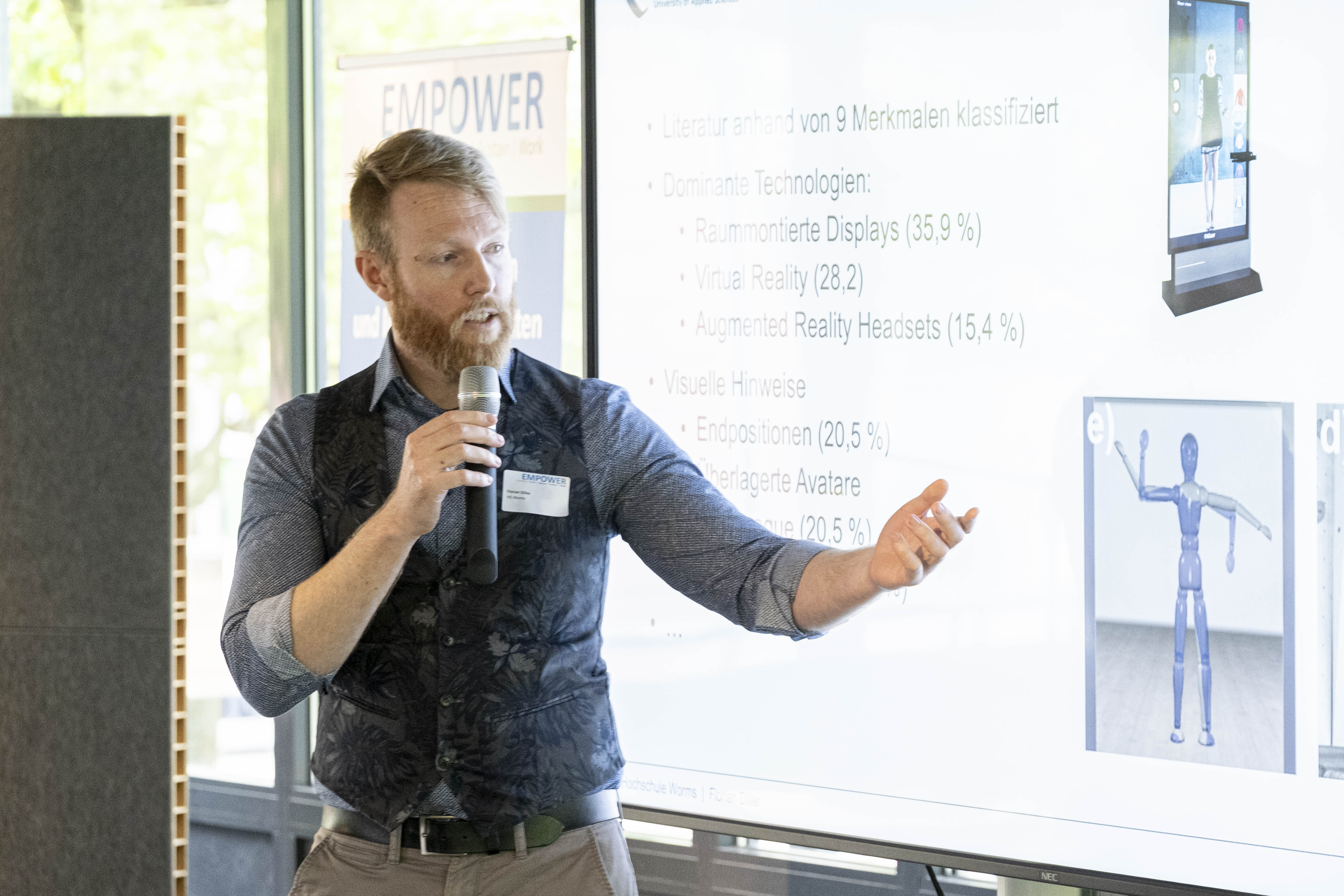 Florian Diller von der Hochschule Worms zeigte auf, wie es mit Augmented Reality und 3D-Technologie gelingen kann, die physiotherapeutische Arbeit auf ein neues Level zu heben, Patientinnen und Patienten präzise Bewegungsabläufe näherzubringen und Therapeutinnen und Therapeuten auf diese Weise zu entlasten.