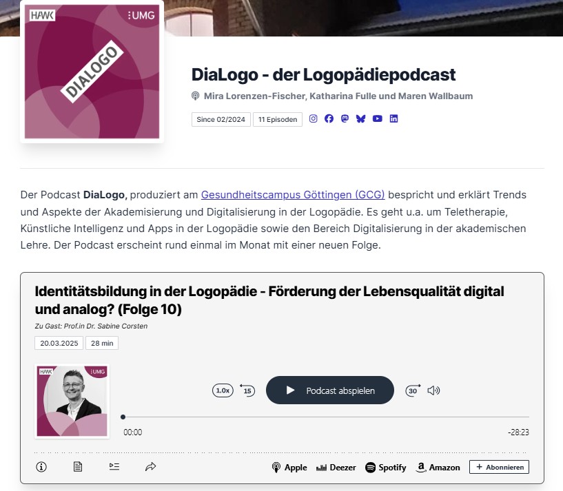 Sabine Corsten, Professorin an der Katholische Hochschule Mainz und Teil der Projektleitung , war im Frühjahr 2025 zu Gast bei „DiaLogo - der Logopädiepodcast“, der am Gesundheitscampus Göttingen produziert wird. Hier gab sie Einblicke in ihre Arbeit zu Identität in der Logopädie und berichtete über ihre Forschungsprojekte, unter anderem kam dabei die Sprache auf das EMPOWER-Projekt „Soziale Teilhabe digital - Apps für ältere Menschen“. Wir haben Folge 10 des Dialogo-Podcast zum Nachhören verlinkt: